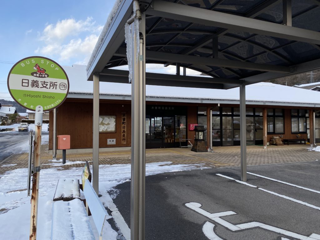 JR中央西線宮ノ越駅で電車を降り、駅を出てまっすぐ徒歩2分ほど歩くと「宮ノ越駅入口」バス停があります。そこから日義巡回線<森林公園方面行き>に乗車し、「日義支所」で下車します。バス停の目の前が日義支所です。バス料金は100円です。