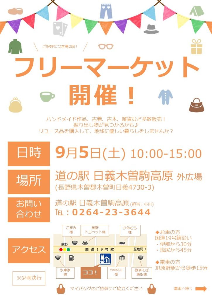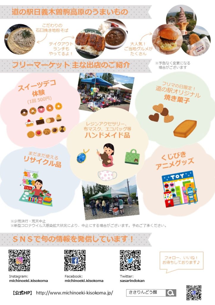 新型コロナウイルスの影響で、木曽郡内でも予定されていた大規模なフリーマーケットは軒並み中止となっています。そのため、商品を売る機会を求めている木曽のハンドメイド作家さんは結構多いようです。というわけで、少しでもそういった地元の方々のお役に立てる機会を作りたいと思いました。