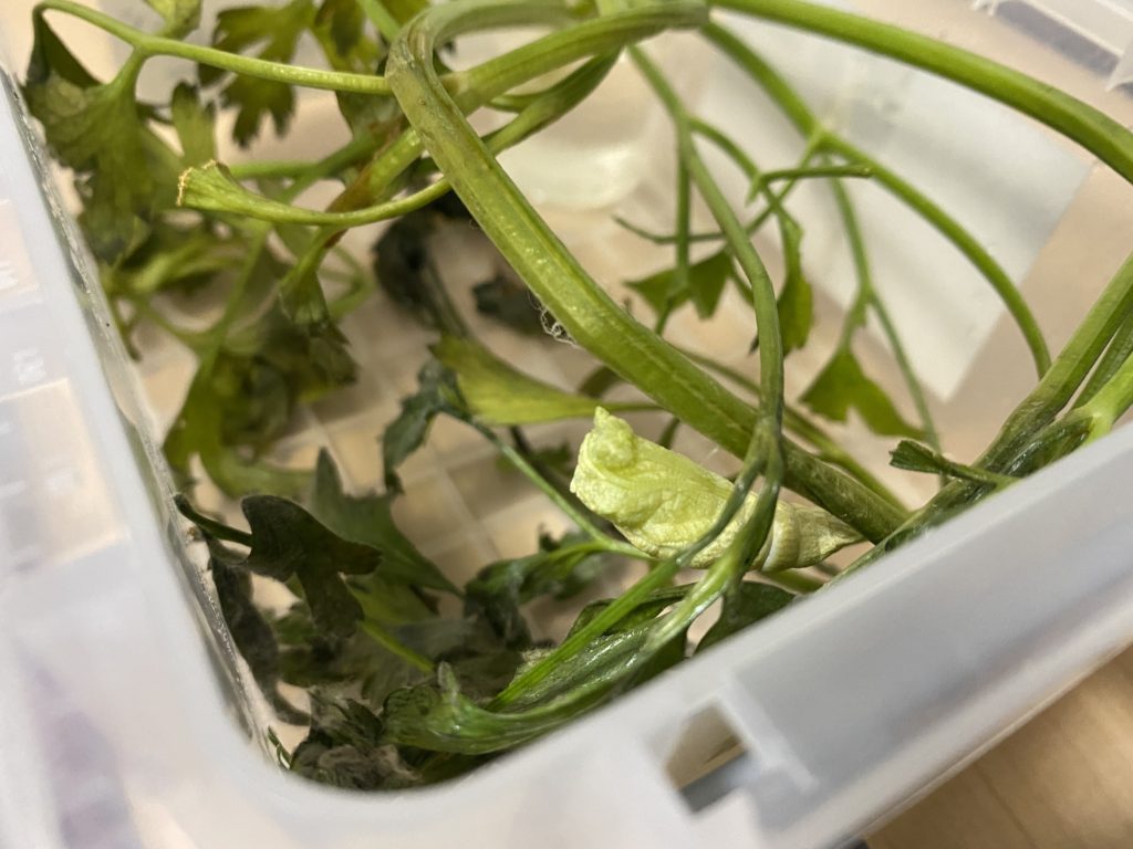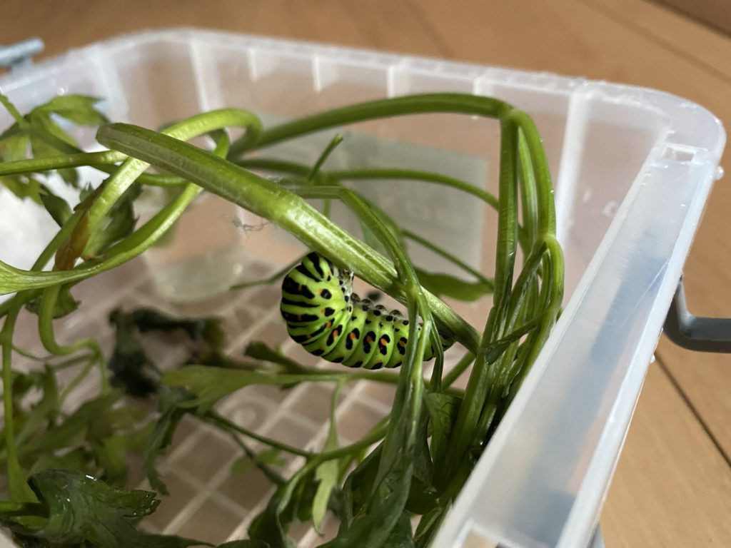 捕獲してからは、虫カゴ代わりにプラスチックのケースに入れて飼育しました。餌は、菜園のイタリアンパセリを与えました。