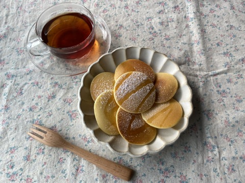 米粉のパンケーキを乗せてみました。花の縁取りで、パンケーキがより可愛らしく見えます。