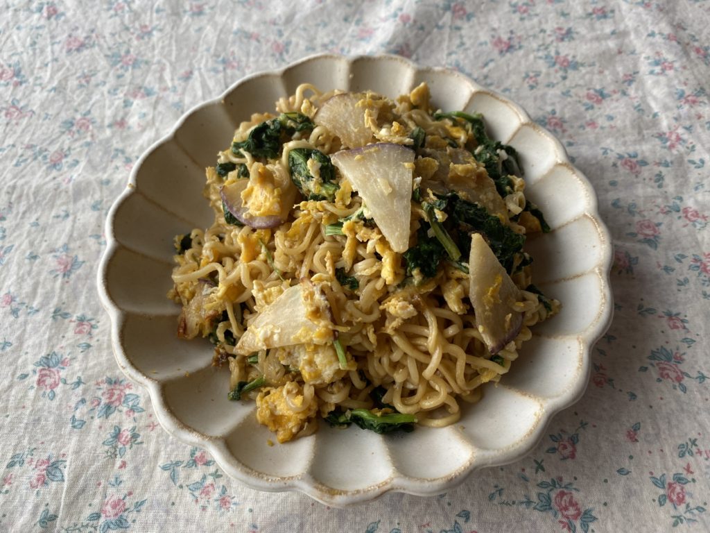 ミーゴレンを盛ってみました。ジャンキーな食べ物なのに、輪花皿に盛るとちょっと高級感が出るような気がします。