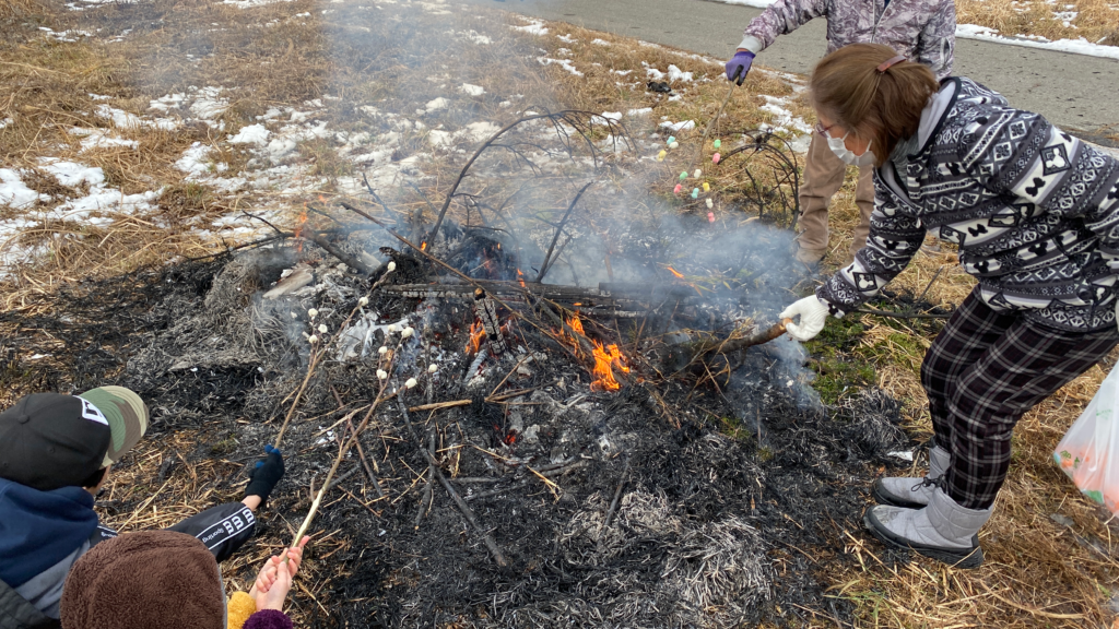 やぐらが焼け落ちてしまうと、参加者はそれぞれ持参した餅を残り火で焼いていました。どんど焼きで焼いた餅を食べると、その1年は健康に過ごせるのだとか。ほとんどの参加者が持っていた餅は、切り餅をアルミホイルに蒔いたものでした。中には、餅焼用の網まで持参している方もいました。柳の枝につけた繭玉を持参していたのは、お2人だけでした。
