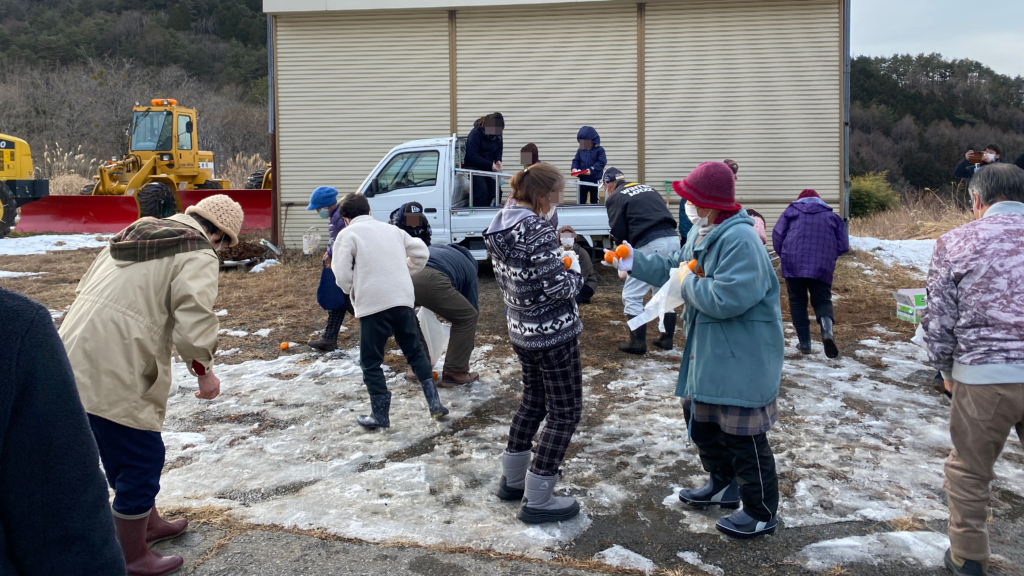 やぐらが燃え盛っている間、お菓子とみかん、小銭のばらまきが行われました。集まった参加者に向かって子どもがお菓子や小銭を投げ、大人はそれを拾います。みかんは投げると潰れてしまうので、転がしていました。参加者はみんな、拾ったお菓子を入れるためのビニール袋を持参していました。