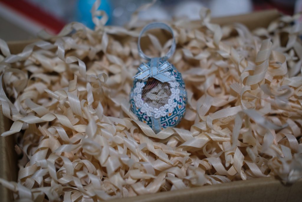 卵の殻に布を貼りつけてイースターエッグにします。今回はクリスマスが近いので、吊るせるようにリボンを付けることで、オーナメントにしました。