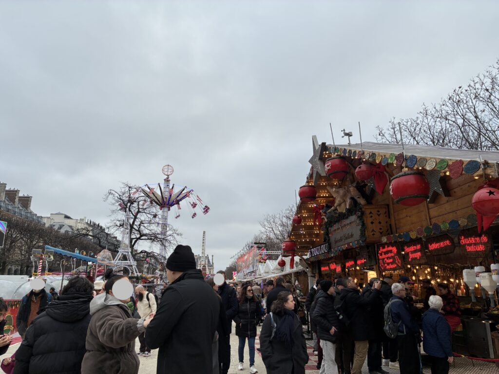 ルーブル美術館のすぐそばでは、クリスマスマーケットが開催されていました。チーズやホットワイン、マカロンなど、いかにもフランスらしいお店が軒を連ねていて、見ているだけでもワクワクしました。