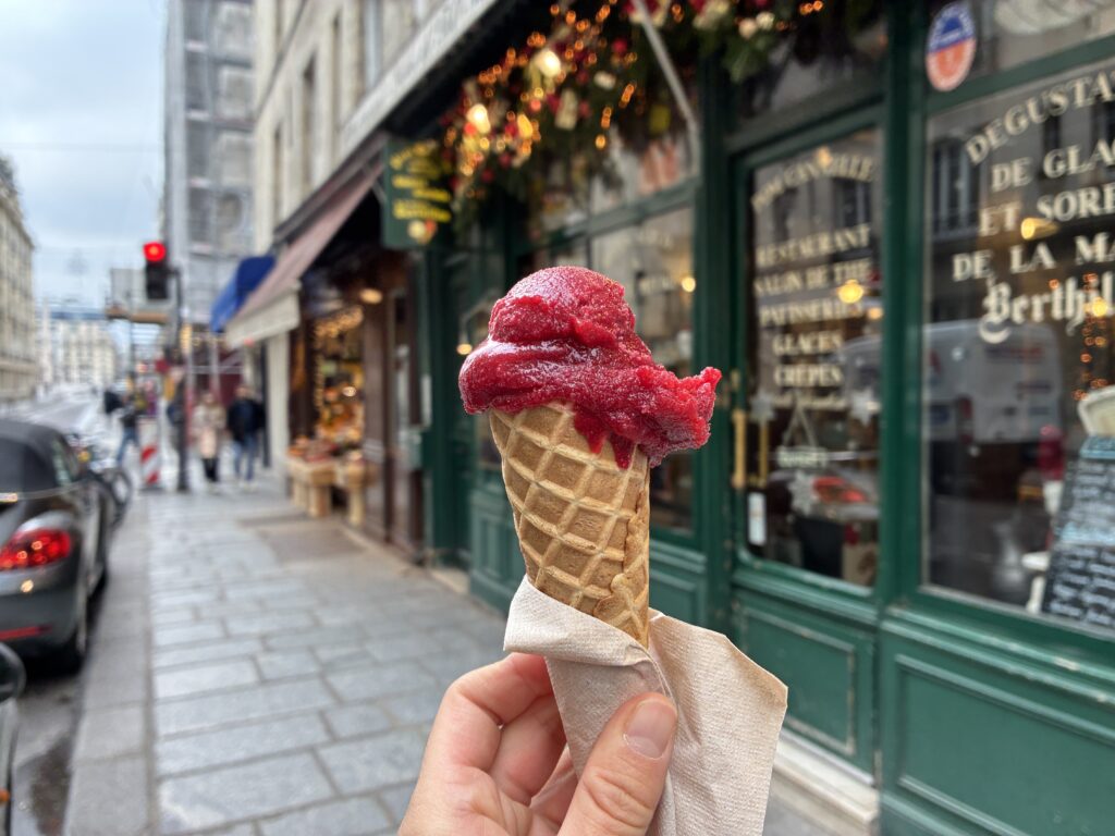 せっかくなので、Berthillon(ベルティヨン)というカフェでジェラートを買ってみました。フランスらしいな、と思い、フランボワーズ味を選択。