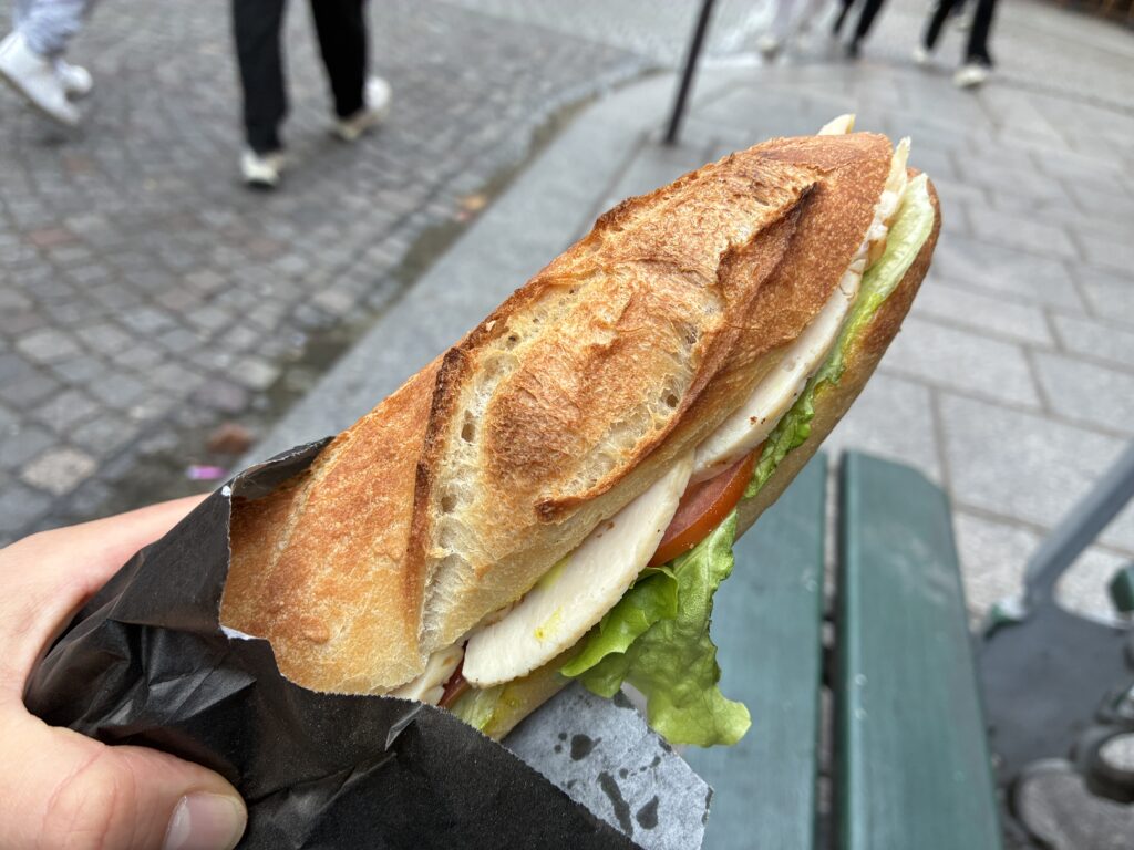 Maison Hubertというブーランジェリーでサンドイッチを購入し、お店の前にあったベンチに座っていただきました。硬めのパンに、しっとりとした鶏ハムが挟まれていて、とても美味しかったです。