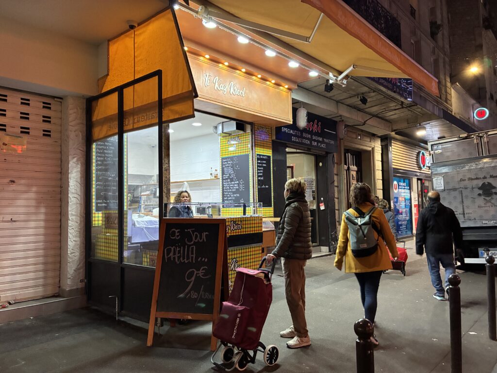 滞在先への帰り道、飲食店や八百屋さん、スーパーなどが立ち並ぶエリアを見つけました。歩いているだけで楽しそうな雰囲気の中に、Ti Kaz Kréolという美味しそうなお惣菜屋さんがあり、そこで夕飯のおかずを購入することにしました。こちらは量り売りのお店でした。