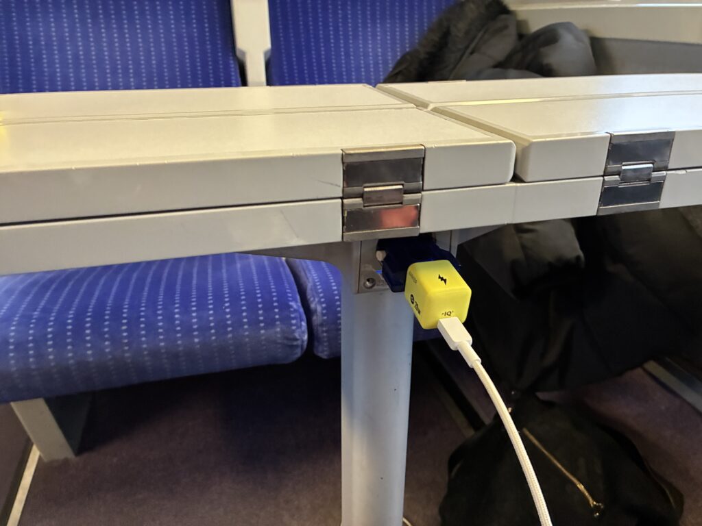 私の座席は、2階建て車両の1階にある4人掛け席の通路側。座席には2人につき1つの電源があり、スマホの充電も問題なくできました。長時間移動でも、これなら安心です。