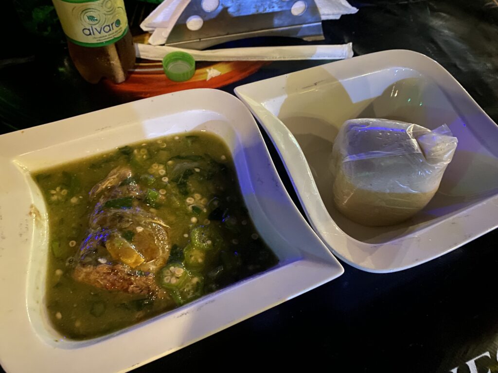最寄りのレストラン「PKD’s」に入り、バンクーとオクロシチューをオーダー。食事が運ばれてくるまで、同期のAbenaはCLUB(ガーナのビール)、私はalvaro(アルバロ、ガーナの微炭酸ジュース)を飲みながら待ちました。しばらくすると、電気は復旧しました。