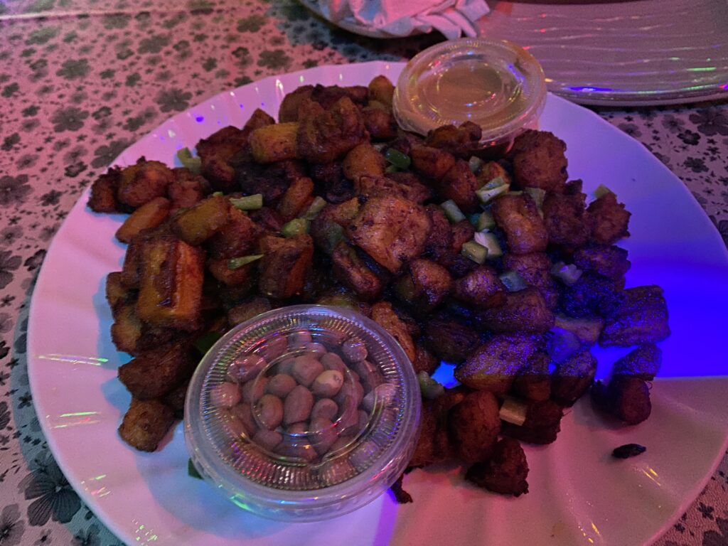 私はKelewele(ケレウェレ、辛く味付けして揚げたプランテーン)を注文。料理が運ばれてきたら、想像した量の倍はあって、食べきれませんでした。