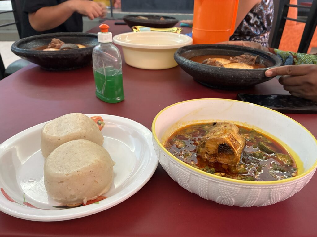 メニューを見ると、ガーナ北部でしか食べられないTZを発見! 「これは絶対食べないと!」と思って注文しましたが、この日は提供していないとのこと。続いて、アンペシヤム with パラバソース(ほうれん草のソースのようなもの)を頼むと「40分くらいかかる」と言われ、こちらも断念。結局、定番のバンクー with オクラシチューに落ち着きました。