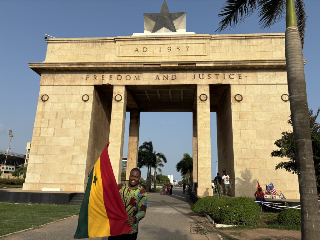 買い物の後は、首都アクラのランドマーク「Black Star Square(Independence Square)」へ行き、記念撮影をしました。近年の SNS の流行に合わせて始まったらしい、ガーナ国旗のレンタル&撮影サービスを提供している人もいて驚きました。私の隊員時代には、ここで写真や動画を撮っている人なんて全くいなかったのに、この日はたくさんの人が写真や動画の撮影に勤しんでいました。