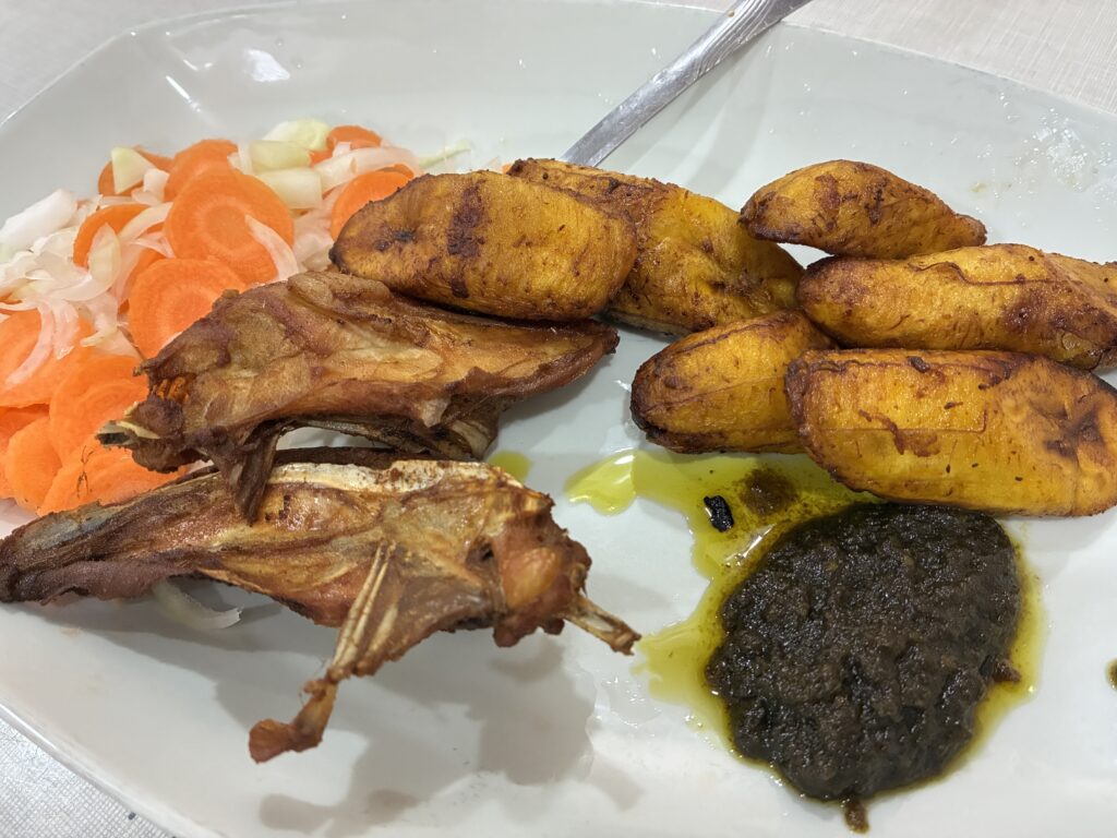 夕食はフライドプランテーンをいただきました。フライドチキンとサラダが添えられていて、コートジボワールの食文化なのか、ガーナではあまり見かけない食べ合わせでした。