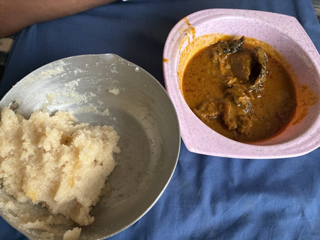 家に着いてしばらく休憩したあと、Charityと一緒に遅めの昼食をいただきました。この日のメニューは、エバ(Eba)と作り置きのパームナッツスープでした。エバは、キャッサバを乾燥させて粗い粉状にした「ガリ」をお湯で練ったもので、バンクーやケンケ等と比べてクセは少なく、食べやすい料理です。今回も美味しくいただきました。