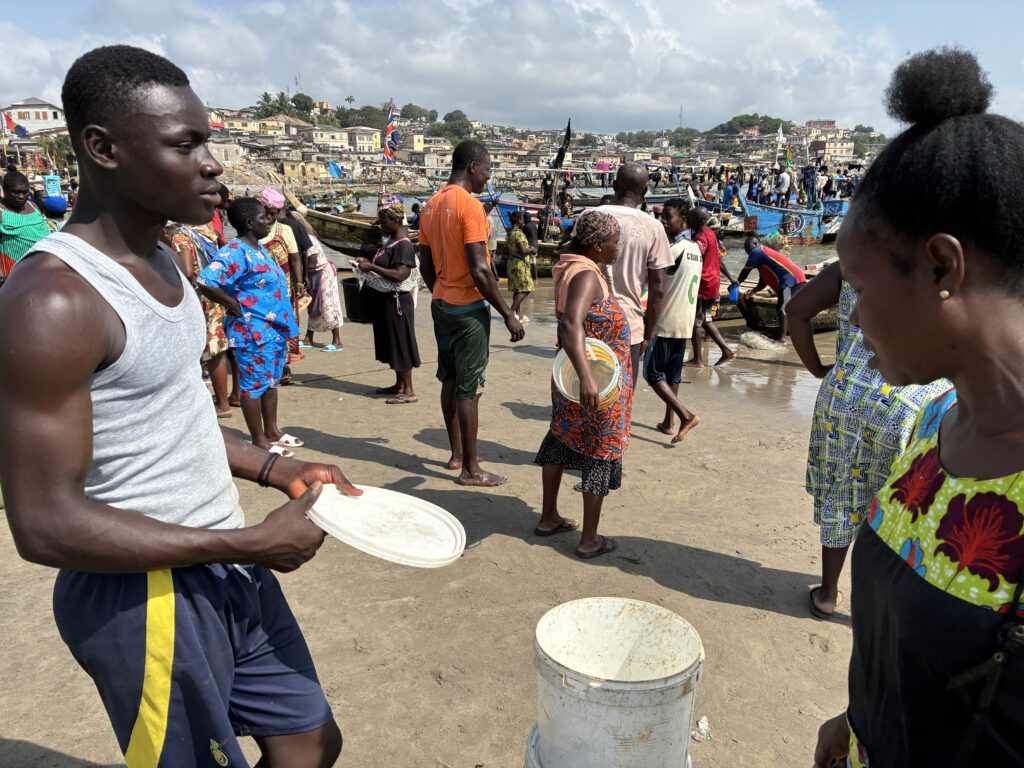 ケープコーストのフィッシュマーケットは、世界遺産・ケープコースト城のすぐ隣にあるビーチです。「フィッシュマーケット」といっても日本のように市場があるわけではありません。漁師が魚の入ったバケツを持って海から上がってきたところを見つけ、その人から直接魚を買うしくみです。