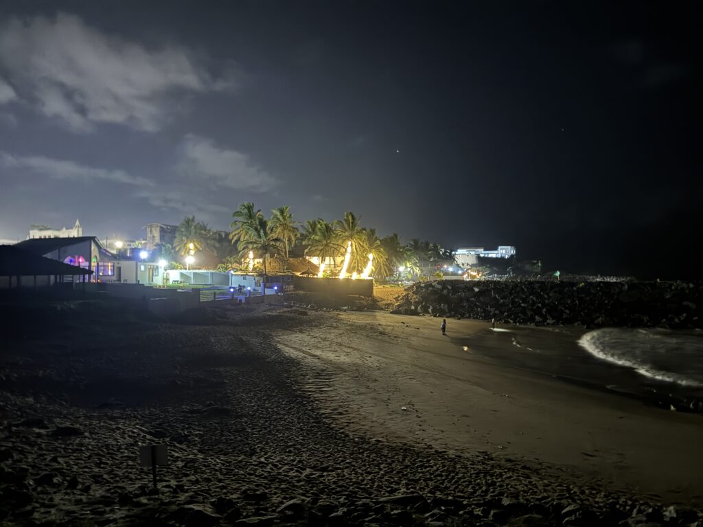 その後はマーケットへ行き、ココナッツウォーターを買ってもらい、それを持ってケープコースト城まで行きました。車を停め、夜のビーチを散策しました。