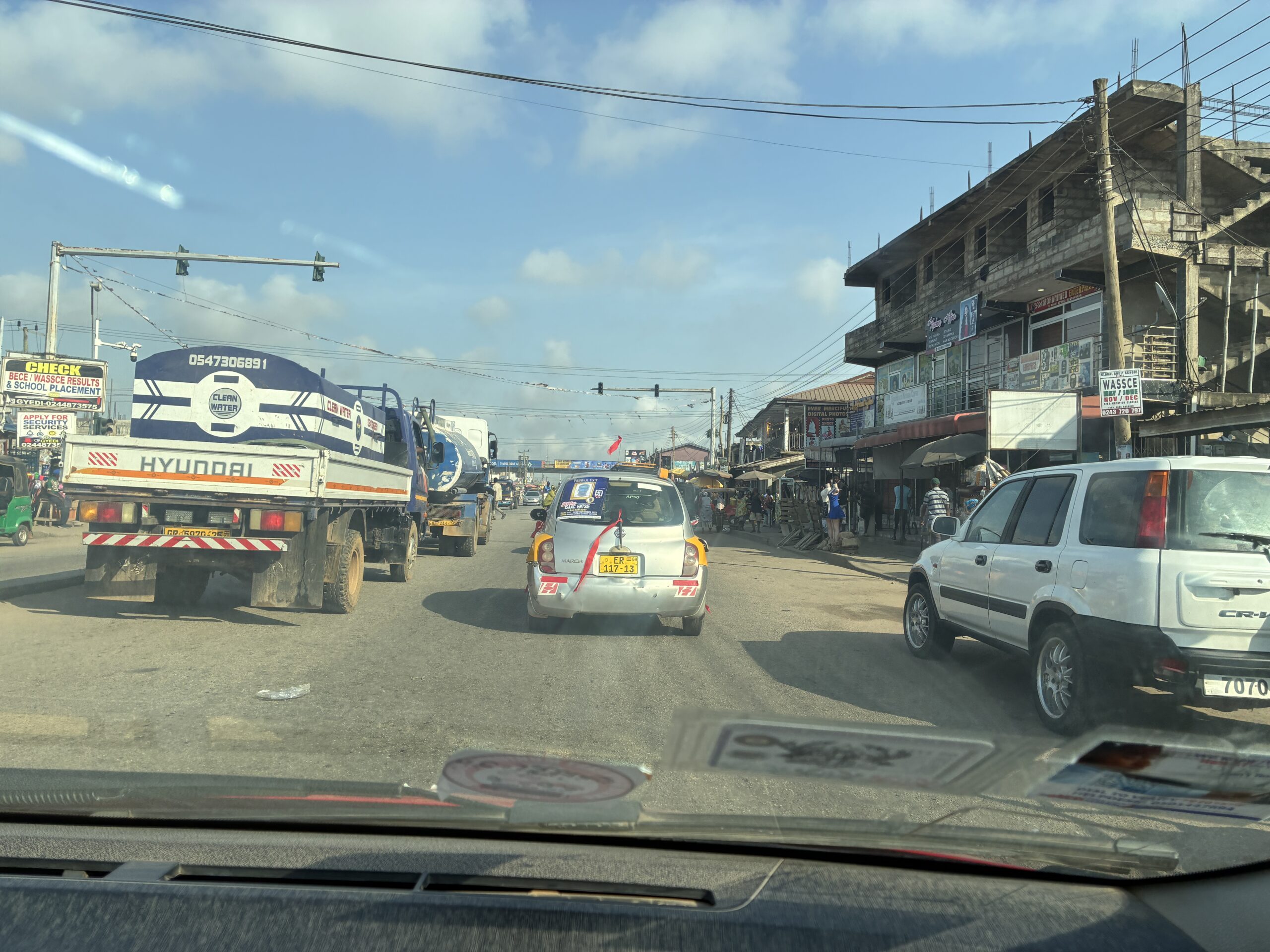 Mallam Junction を抜けて Accra の中心へ入ると、さすがに渋滞が始まりました。「飛行機に間に合うかな……」と不安がよぎりましたが、焦っても車は早く進まない。最後のガーナの空気を楽しもうと、道ゆく物売りの人たちを眺めて気を紛らわせました。