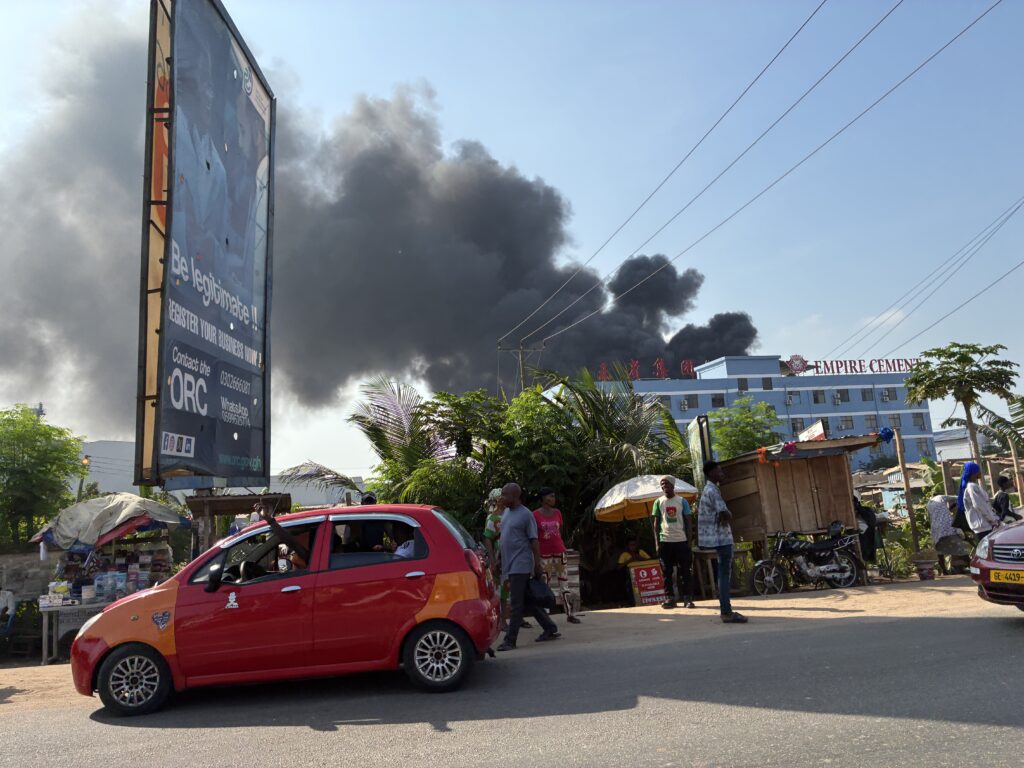途中、Weija(Mallam Junction より Kasoa 寄り)のあたりで、真っ黒な煙がもうもうと上がっているのが見えました。火もはっきり見えるほどの大きな火事。後日調べたところ、プラスチック工場が火災を起こしていたようです。