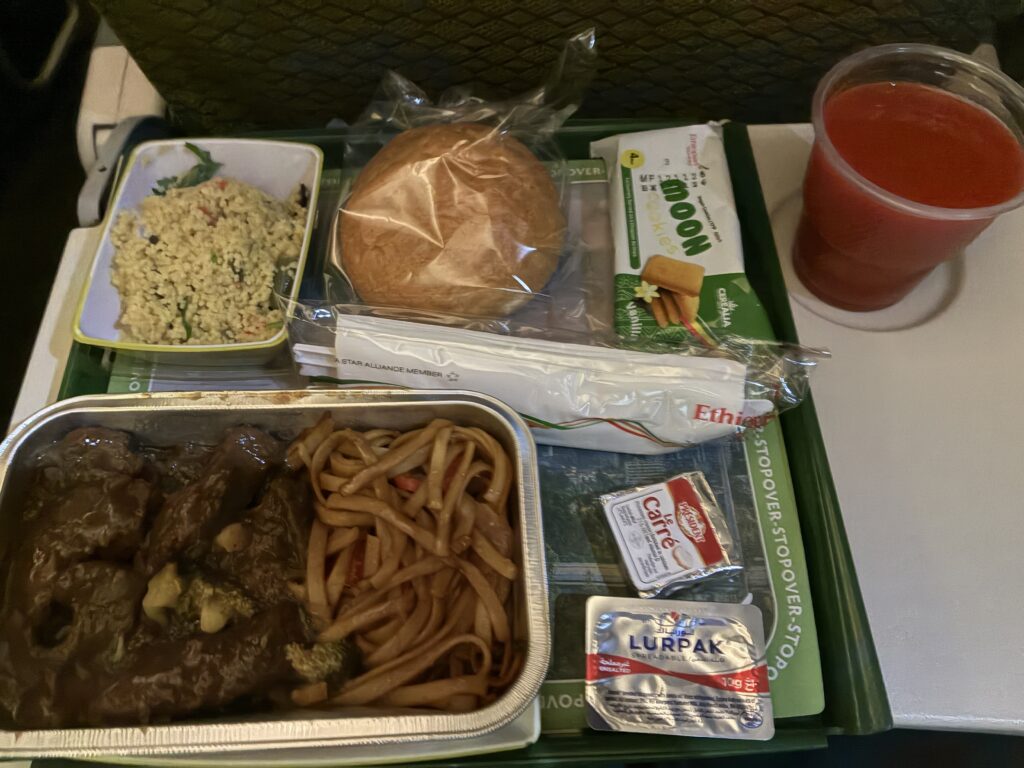行きでチキン攻めに遭った経験から、「エチオピア航空ではチキンは避けるべし」と学習済み。普段ならビーフは選ばない私ですが、今回は迷わずビーフに。普通に美味しく食べられるお味でした。ただ、これも2〜3回続けば飽きそうだな、とは思いました。