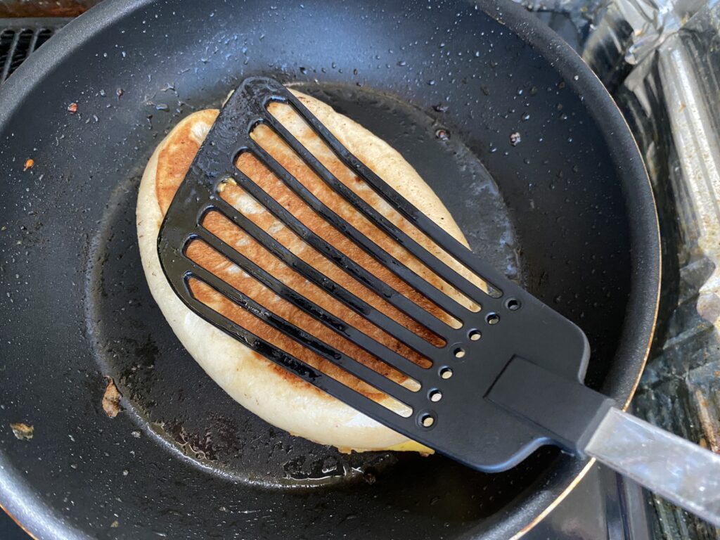 焼き上がった卵をパンに挟んで、今度はパンをフライパンで焼きます。パンはフライ返しで押さえつけて、焼き色をつけます。