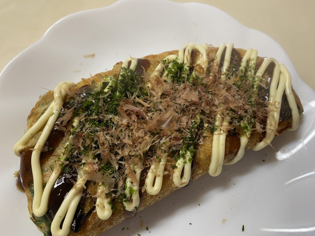 - お皿に移し、お好みソース、マヨネーズ、鰹節、青のりをトッピングする。