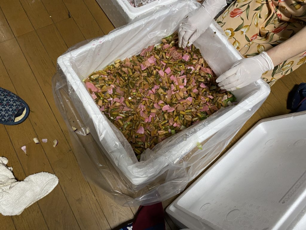 赤かぶの葉と、赤かぶの根元、そして赤かぶ本体をそれぞれ切り離して用意しておきます。1回すんきを作るのに、3kg程度の赤かぶの葉を用意するのが一般的です。そして根元は乳酸発酵に欠かせない部分です。