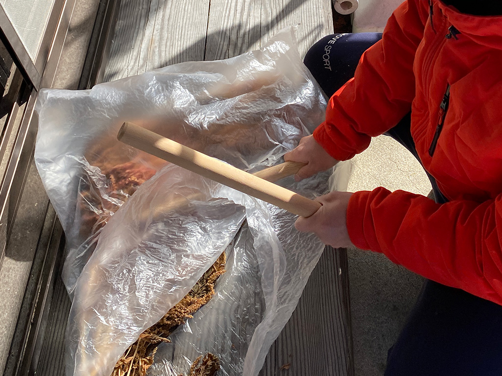 乾いたアマランサスを茎ごと袋に入れ、麺棒で叩きます。叩くと、実が穂から落ちます。