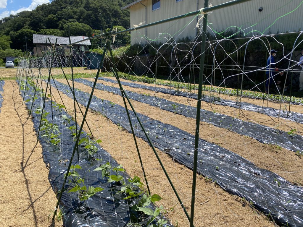 今回植えたモロッコインゲンは、「つるあり種」です。そのため、つるが巻きつくためのネットが必要です。このネットのことを「棚」と呼んでいます。