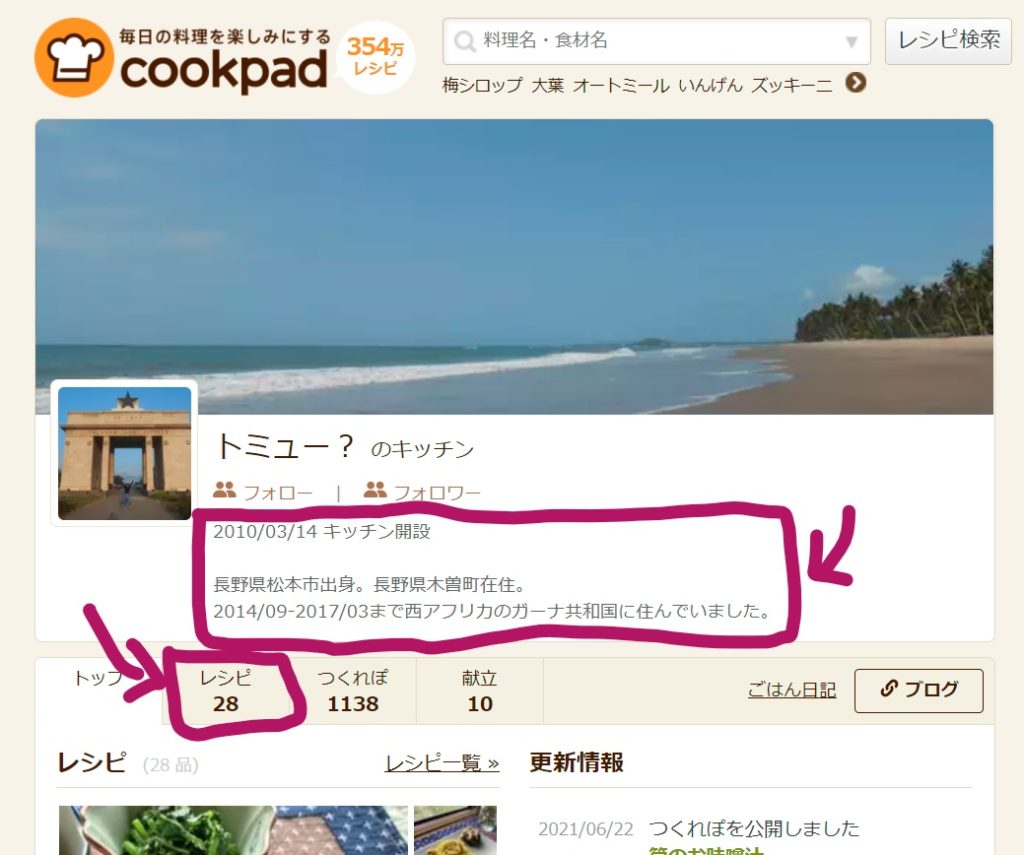 レシピ作者さんの個人ページで確認するのは、自己紹介文とレシピです。