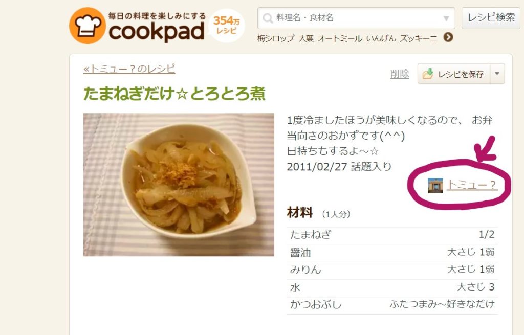 公開されて間もないレシピの場合、つくれぽの件数が0件ということもあります。そんなときは、レシピ作者さんの個人ページに遷移してみましょう。