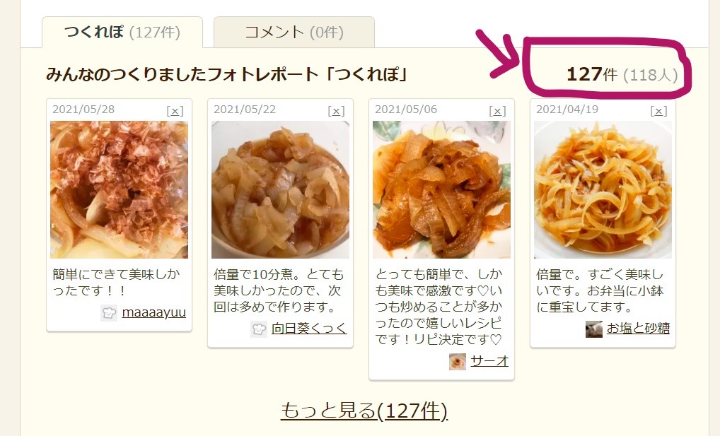 つくれぽの件数は、件数の横に、つくれぽを投稿した人数も表示されています。たとえば、つくれぽの件数が「10件(1人)」と表示されている場合、1人の人が10回リピートしている、ということです。