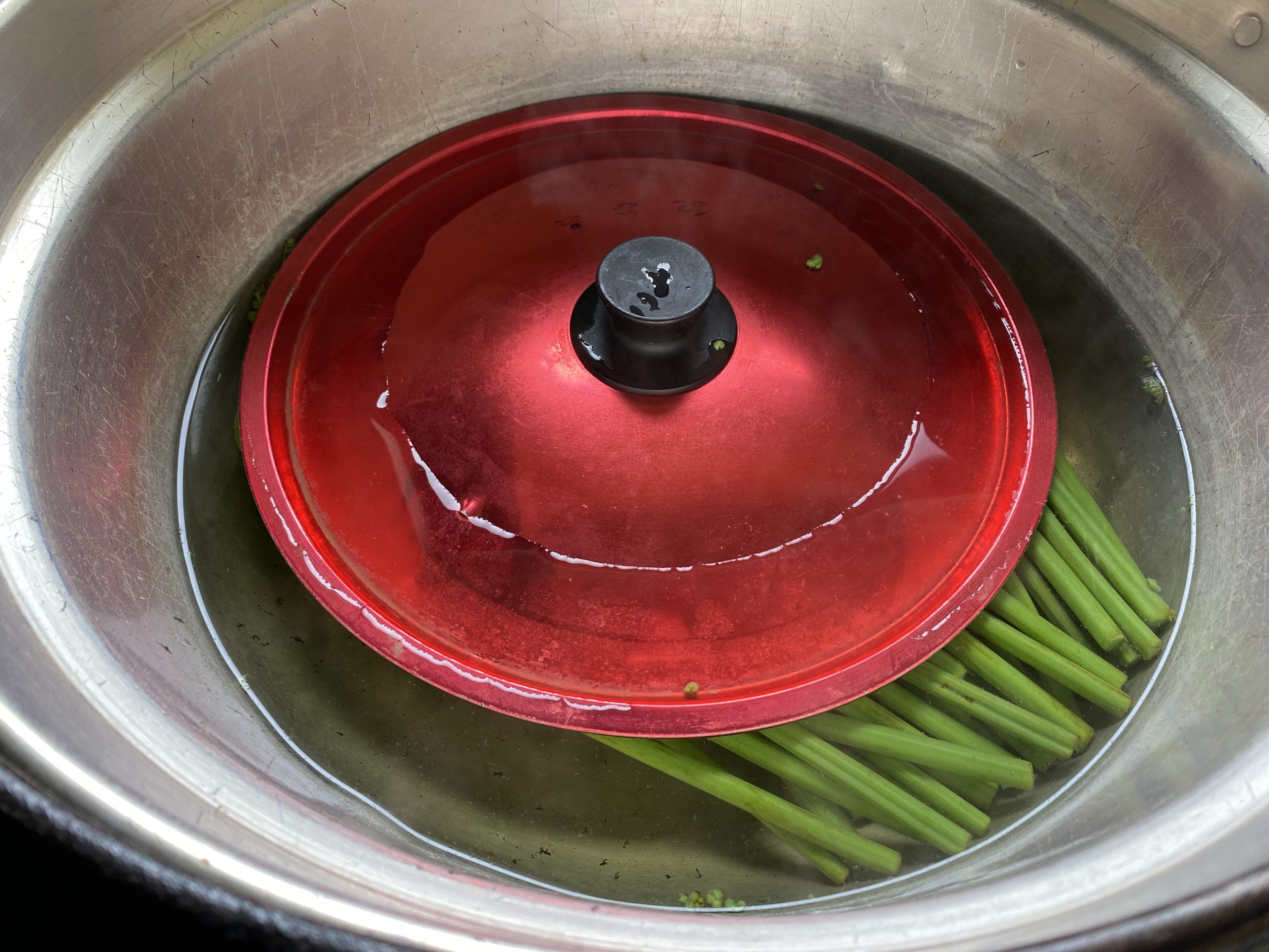 ワラビが完全にお湯に浸かるように整えたら、ワラビが浮かないように落とし蓋をします。