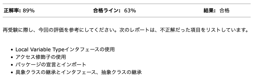 結果には、合否だけでなく、正答率や分野ごとの正誤も記載されていました。