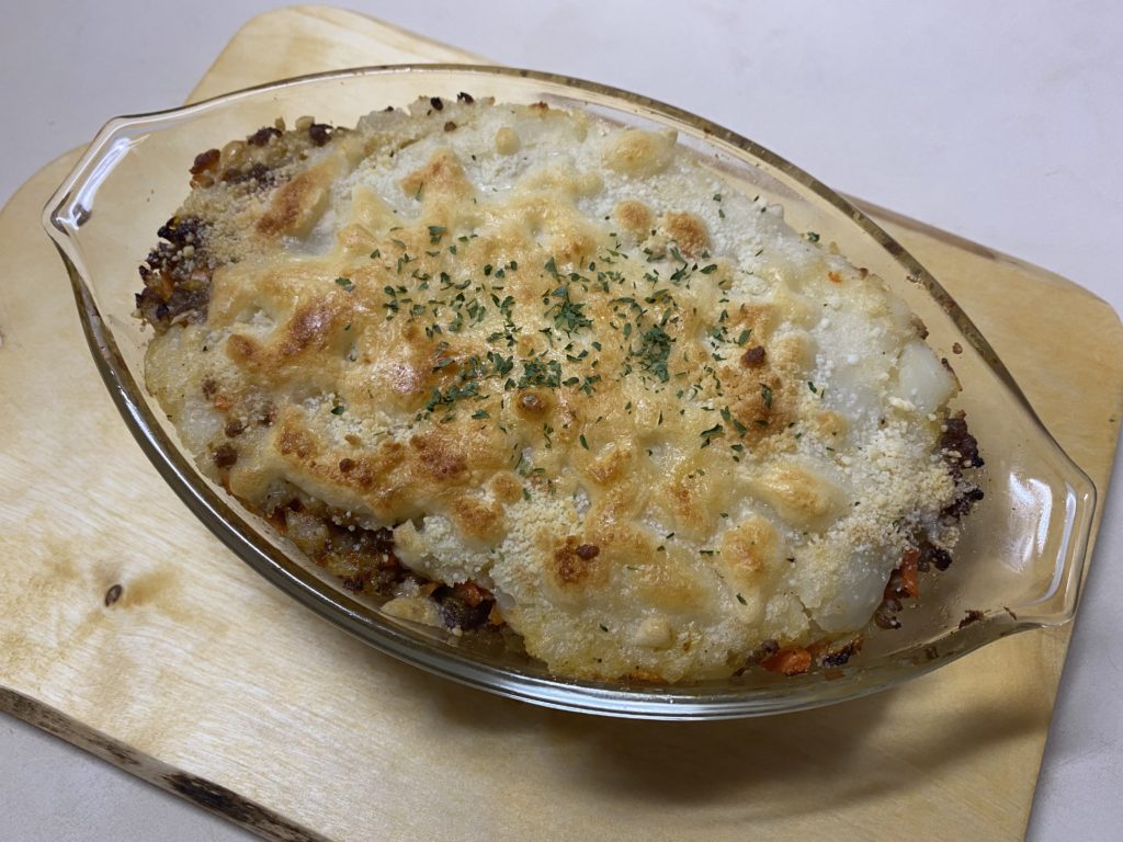 じゃがいもをマッシュポテトにして、玉ねぎ・人参と一緒に炒めたひき肉と交互に器に並べて焼いたものです。