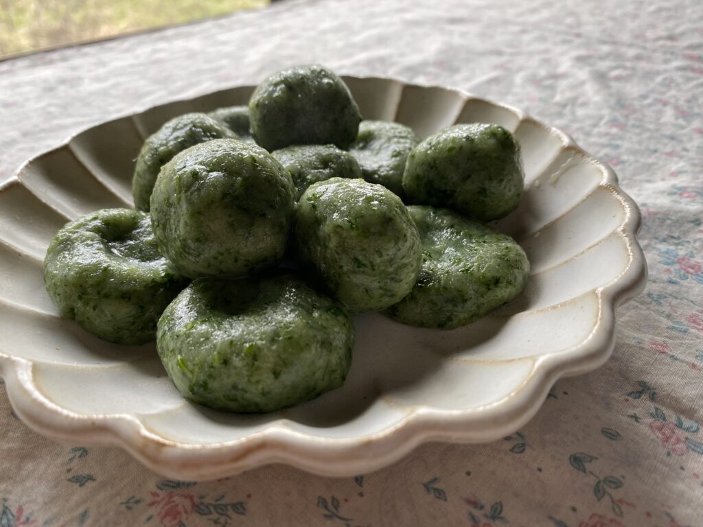 畑に生えているよもぎを収穫して、お団子にしました。若芽を使ったせいか、案外よもぎの風味は感じられませんでした。それでもお団子としての味は美味しく、春を感じられる一品でした。
