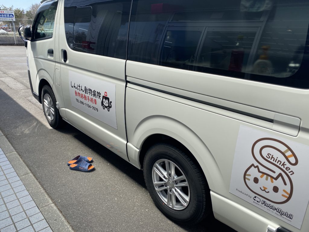 この日は、ネコの去勢・堕胎手術が行われるということで見学させていただきました。会場は「家族葬ホール向陽」でした。ここに出張手術の車が来ていました。