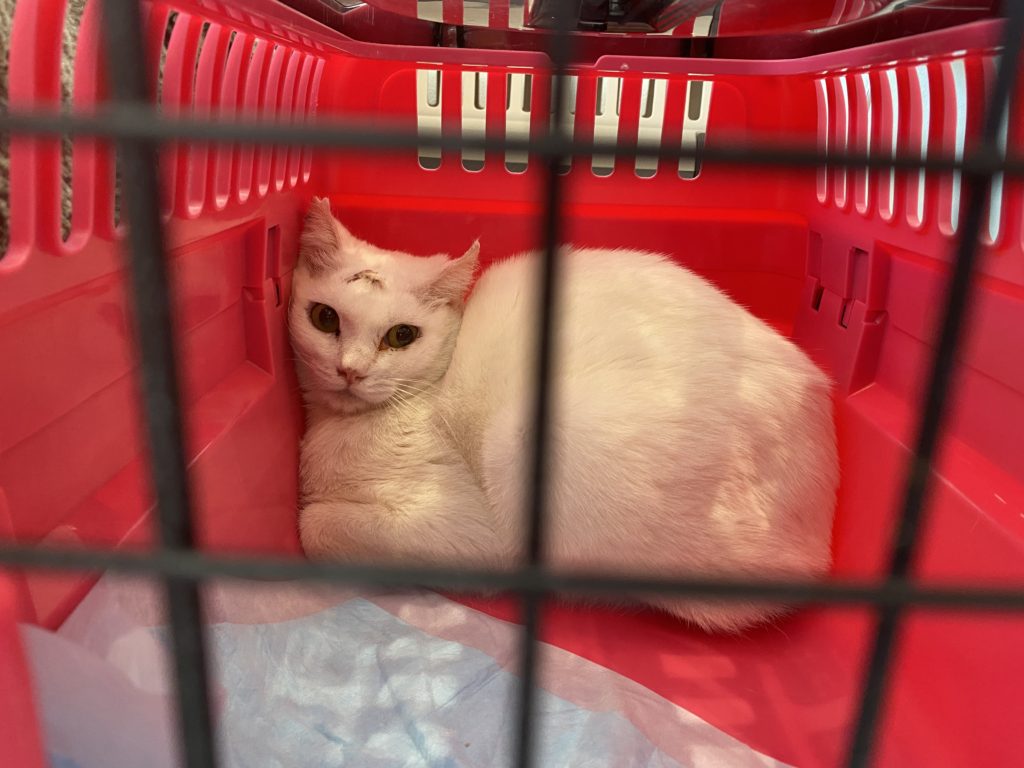 会場では、数匹のネコがケージに入って待機していました。