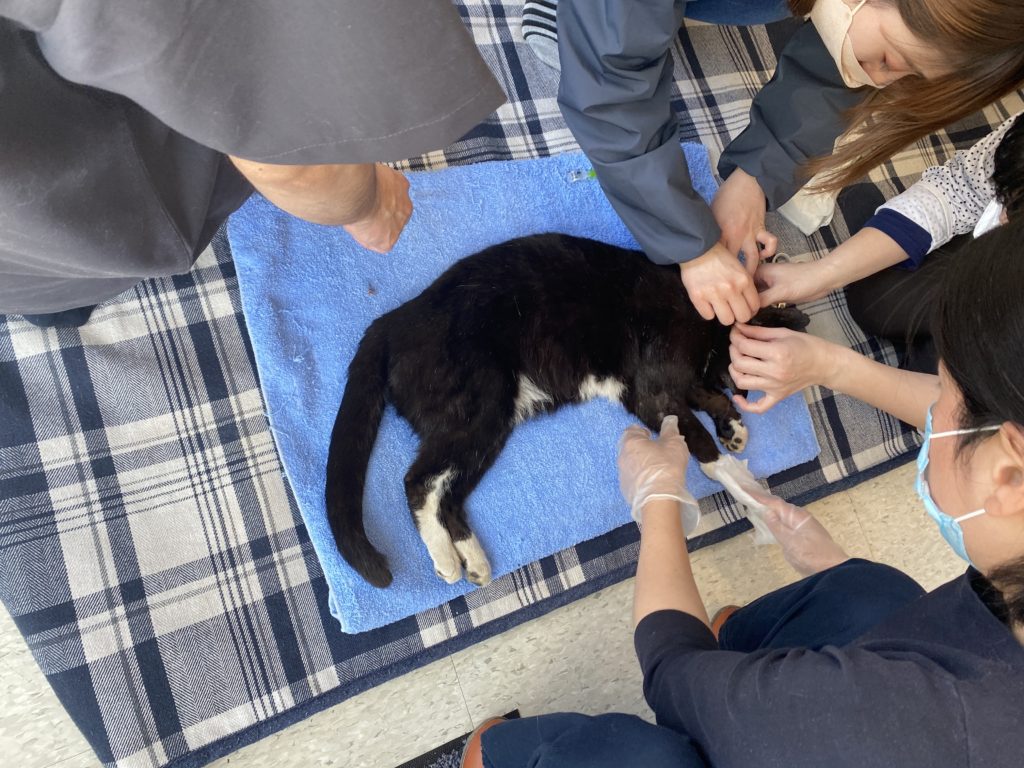 ネコは手術前に麻酔を打たれます。ぐったりして動かなくなると、手術が始まります。