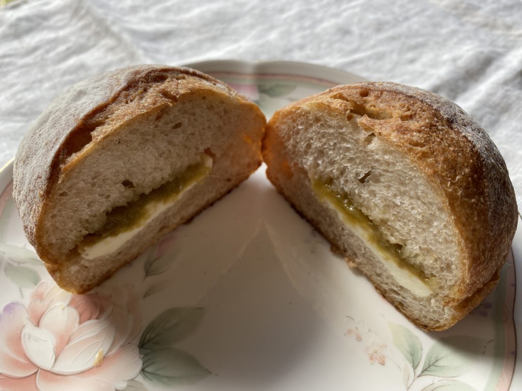 私が購入したのは、ルバーブクリームチーズ(220円)、クランベリーホワイトチョコカカオニブ(320円)、チョコアーモンド(320円)の3つ。天然酵母が使われているためか、どれも少し酸味が感じられるパンでした。ルバーブクリームチーズは、パンの中にルバーブジャムとクリームチーズが挟まれていて、ジャムは自家製とのこと。ジャムの甘酸っぱさがクリームチーズとよく合っていて、とても美味しかったです。