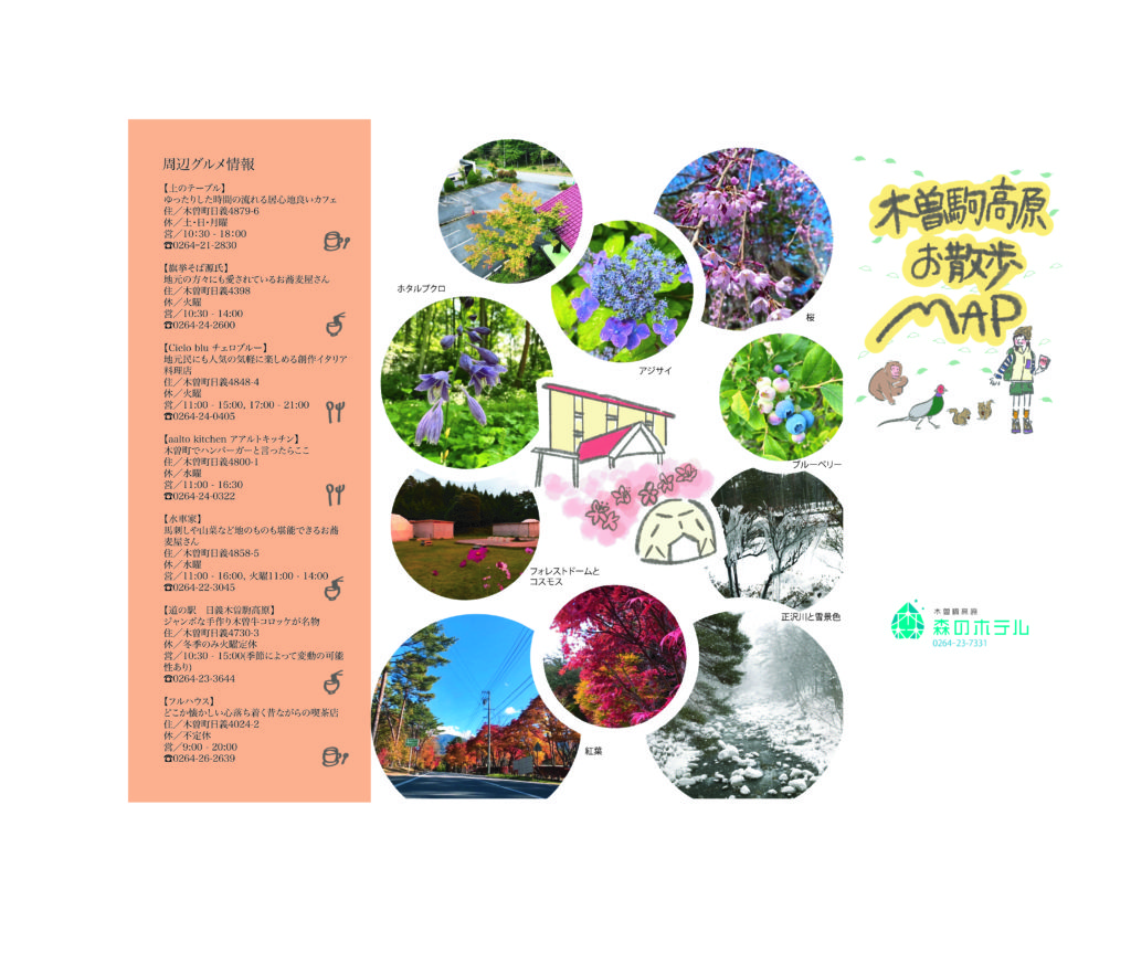 裏面では、木曽駒高原界隈の飲食店情報と、季節ごとに見られる風景と草花を写真で紹介しています。