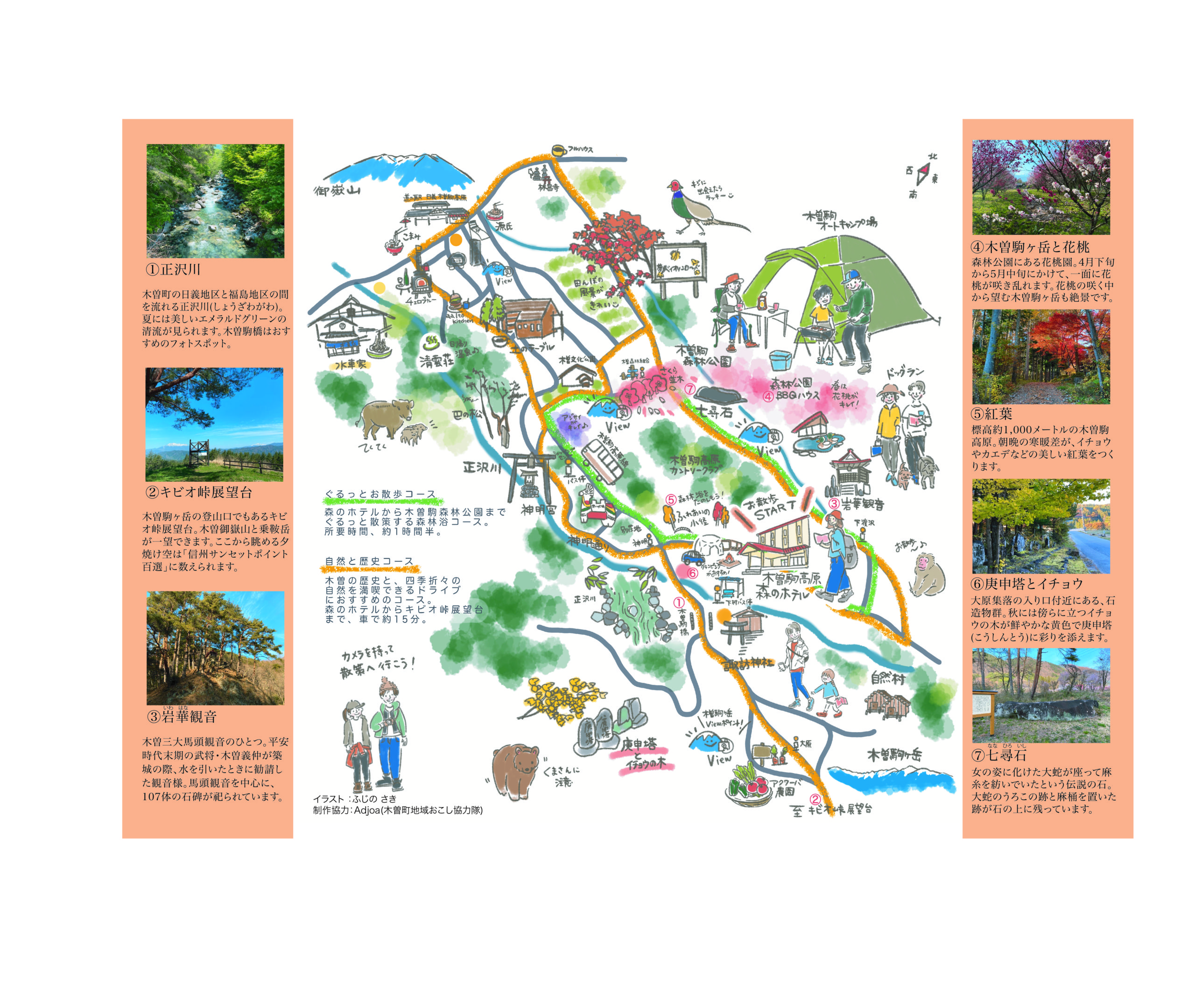 表面には、木曽駒高原在住者おすすめの散歩コースとドライブコースを紹介しています。そして、コース上にある見どころを7つピックアップして掲載しています。