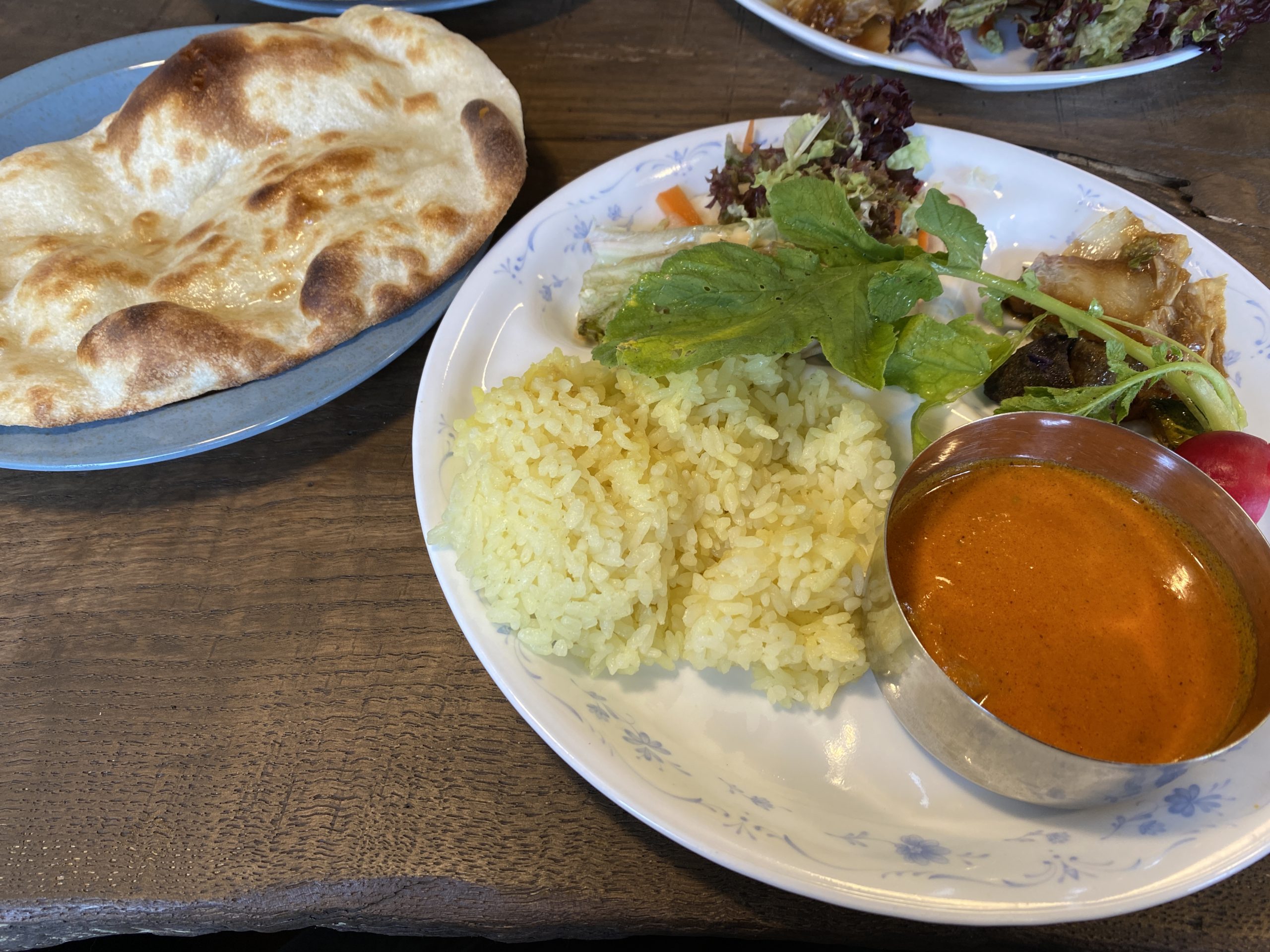私はいただいたのは、バターチキンカレー。カレーを食べるときはいつも、野菜不足が気になってしまう私です。今回いただいたプレートには野菜がたくさん使われていたので、嬉しかったです。添えられていた野菜は虫食いがあり、いかにもオーガニック感があって良かったです。