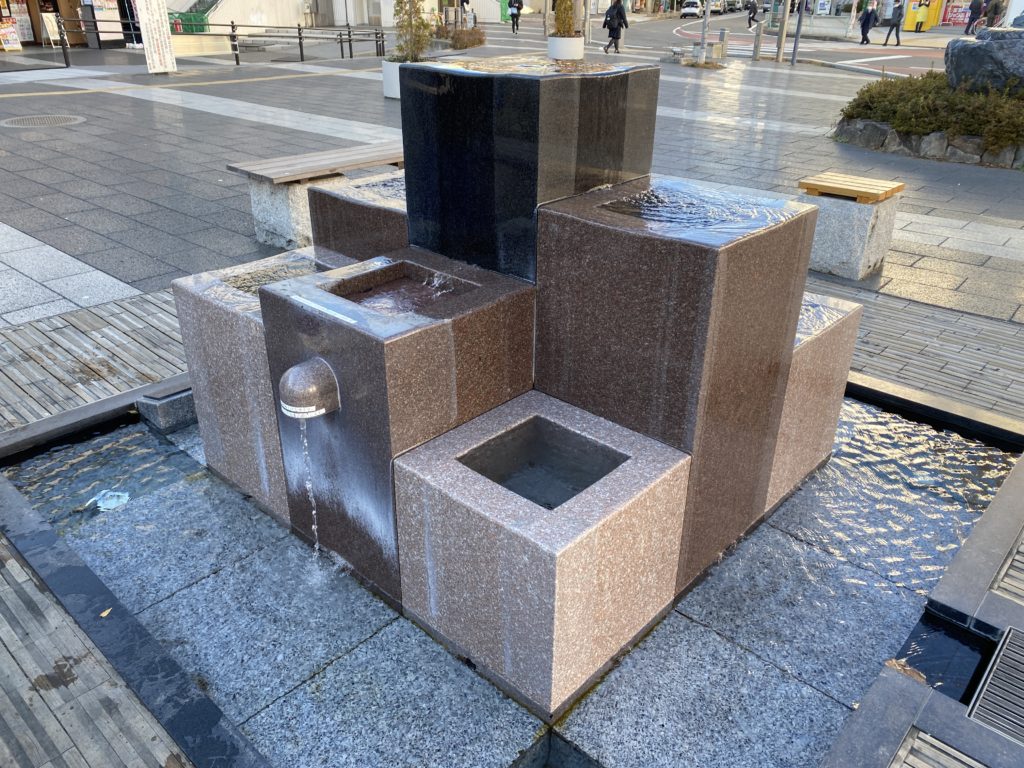 深志の湧水は、高さの異なる四角柱がいくつも合わさった、モダンなデザインの湧水です。おしゃれで水の豊かな松本を象徴するかのようです。