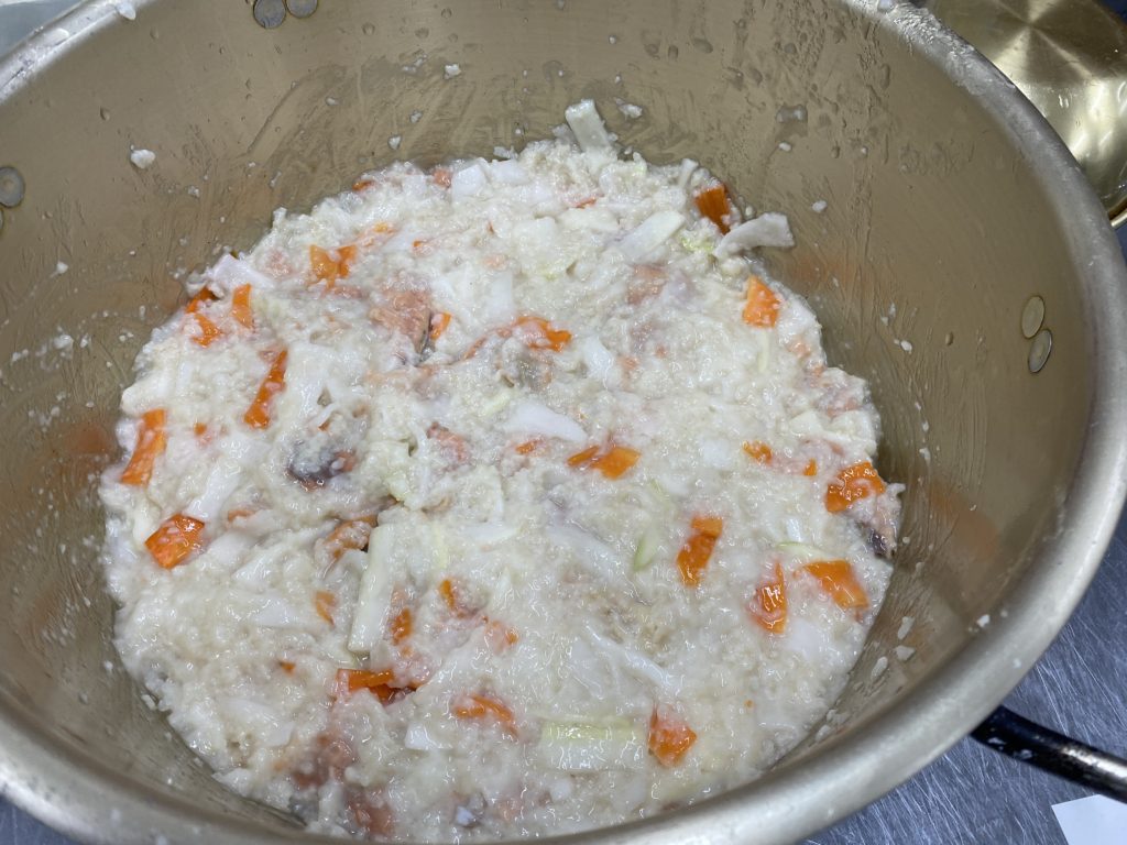 5. 大きめのボウル(鍋でも可)にご飯→大根・人参→鮭の順に振り入れていく。砂糖、酢、塩も適宜振り入れる。これを3~4回繰り返したあと、全体的に混ぜる。味を見て、調味料で好みの味に調整する。