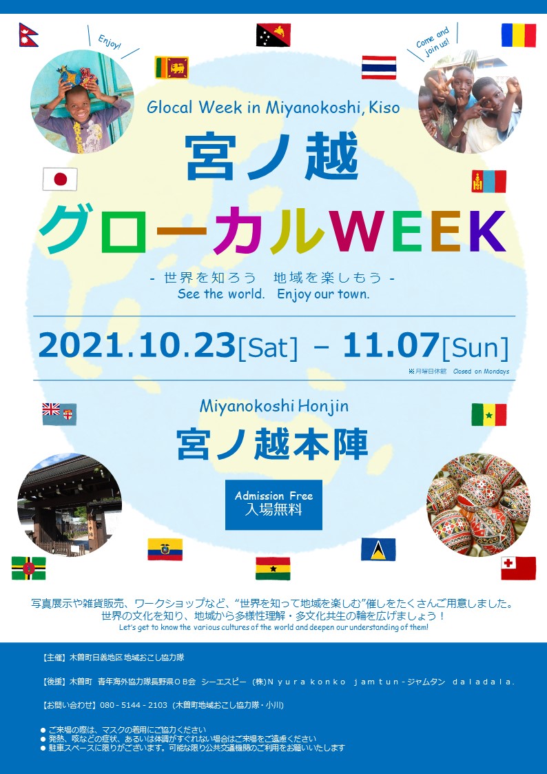 木曽町日義地域おこし協力隊が、宿場町「宮ノ越宿」にて「宮ノ越グローカルWEEK」を開催します。世界の写真展示や雑貨販売、ワークショップなど、“世界を知って地域を楽しむ”イベントです。