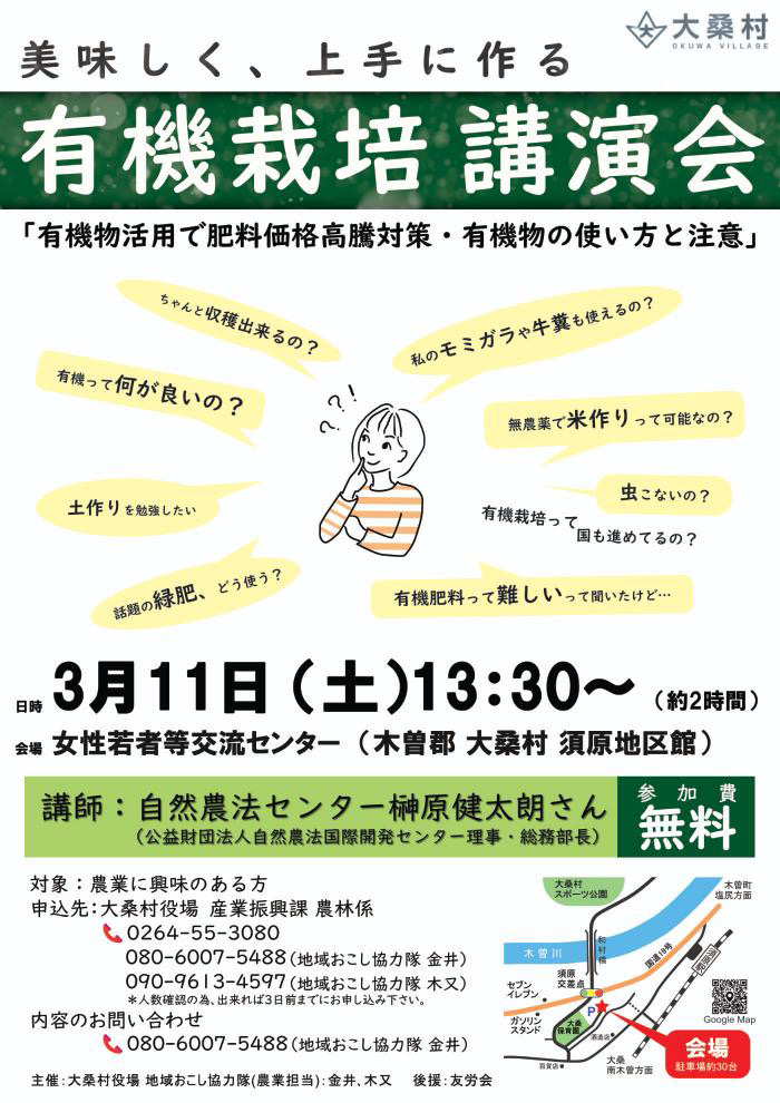 まだ告知前ですが、3月に大桑村で第2回有機栽培講演会を開催予定です。