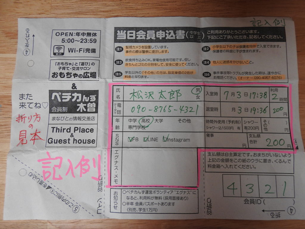 ペチカんずに入室したら、まず受付にて利用者情報を記入します。記入する内容は氏名や連絡先、入室時刻など。記入したら、その紙を自分の利用する席に置いておきます。