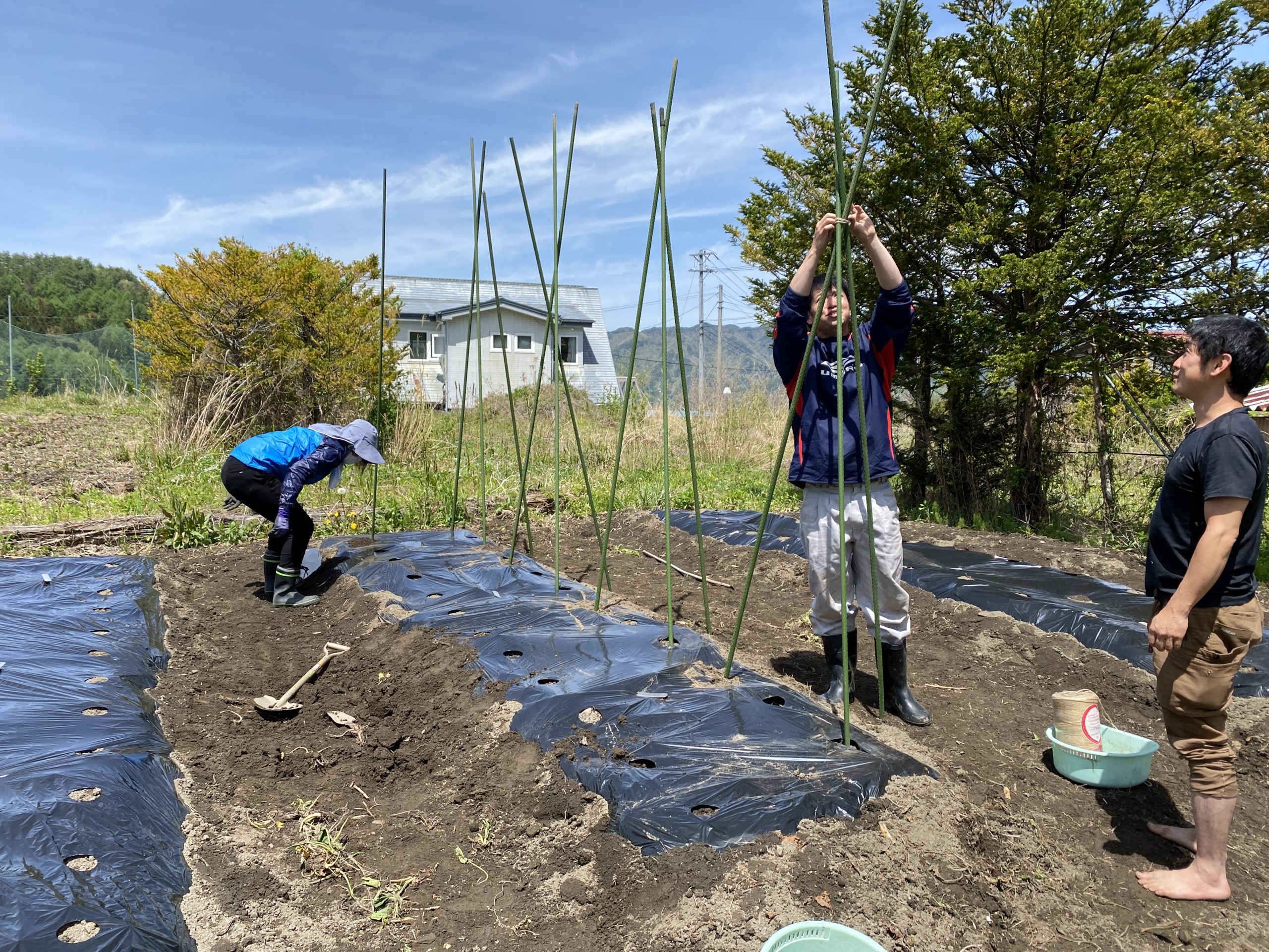 とはいえ、この支柱立ても私1人では難しい作業でした。支柱が倒れないように深くまで挿すのは力がいるし、2mの高さで支柱を結ぶのにも身長がないと難しい。今回は力があって、私よりも身長のある方々にご協力いただいたおかげで、約1時間で10個の種芋を植え付けることができました。