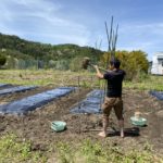 昨年、ここの畑では化学肥料で野菜を作りました。とてもよく育ったので、「もしかしたら肥料なしでも十分育つかもしれない」と考えました。だから何も施さないままマルチをかけました。
